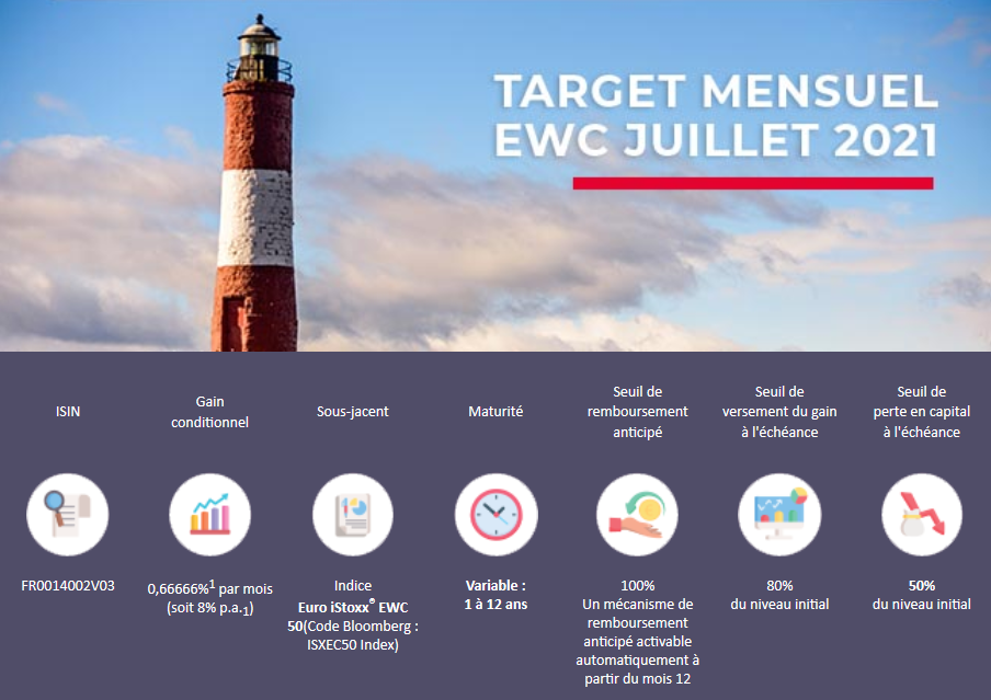 Ce nouveau support permet de bénéficier d’un gain lié à l’évolution de l’indice « Euro iStoxx EWC 50 », sur une durée maximale de 12 ans, avec un objectif de coupon + 0.6667%* par mois.