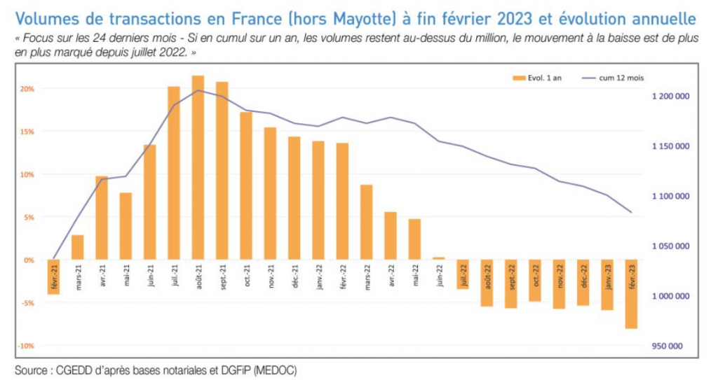 Les prix de l’immobilier ancien ont évolué légèrement à la baisse ce 1er semestre 2023, les évolutions des indices de prix sur 3 mois font état d’une baisse de -0,9 % à fin mai 2023, tant sur l’individuel que sur le collectif. C’est surtout la baisse tendancielle des volumes qui laisse présager d’une baisse des prix à venir (voir graphique ci-dessous).