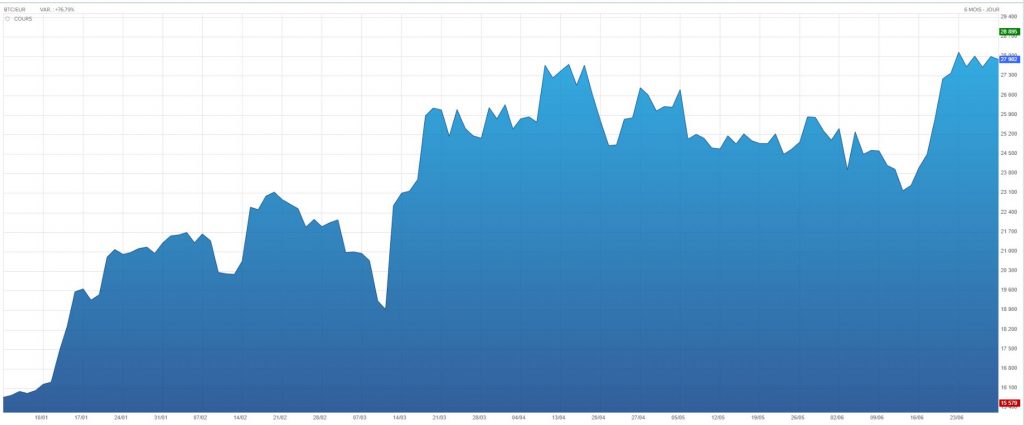 retour à la mode des valeurs technologiques entraine dans son sillage le bitcoin avec une hausse de +81.29% sur le semestre ! Si vous y croyez, achetez, mais le cabinet a toujours (et continue) à déconseiller cet actif purement spéculatif et non réglementé.
