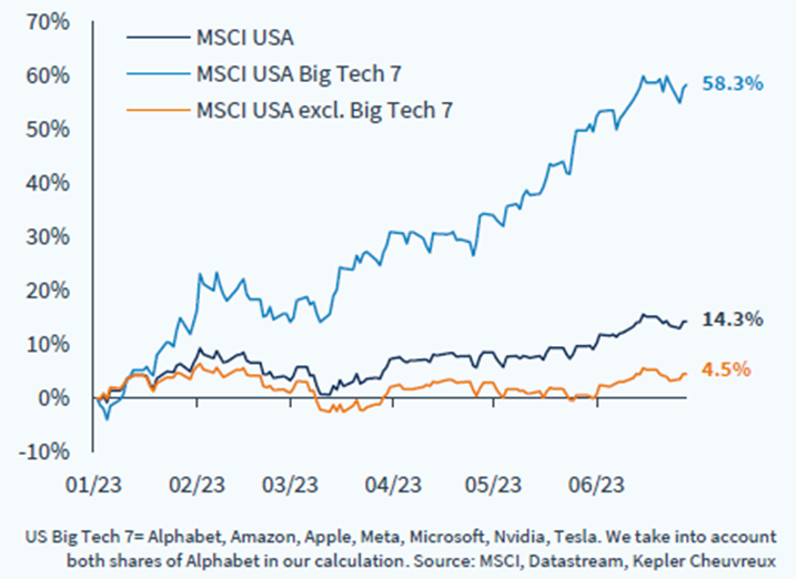 En effet, les résultats sont en trompe l’œil. En regardant de près, les performances sont le fait de progressions extraordinaires de quelques valeurs qui tirent à la hausse l’ensemble des indices. Sur l’indice boursier américain MSCI USA qui progresse de +14.3% en 6 mois (voir graphique ci-dessous), 7 actions (BIG7) ont en moyenne progressé de +58.3% depuis le début de l’année, les autres valeurs de l’indice affichent une hausse moyenne de +4.5%.