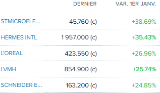 Sur l’indice boursier français le CAC40, c’est le même scénario (voir tableau ci-dessous) avec les performances du secteur du luxe et de la technologie qui tirent l’indice vers le haut.