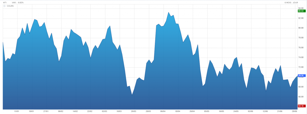 Evolution du prix du baril WTI du 01/01/2023 au 30/06/2023