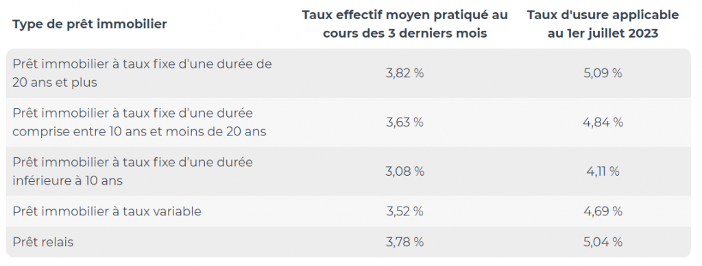La législation impose aux banques un « taux d’usure » c’est-à-dire un taux maximum au-delà duquel il est interdit de prêter : celui-ci vient de passer à 5.09% pour les crédits immobiliers de 20 ans et plus.